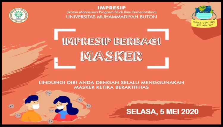 Mahasiswa sebagai Agent Of Sosial didalam kehidupan bermasyarakat perlu memperhatikan masalah yang terjadi saat ini. Melihat hal tersebut, Keluarga Besar Ikatan Mahasiswa Program Studi Ilmu Pemerintahan (IMPRESIP), Fakultas Ilmu Sosial dan Ilmu Politik, Universitas Muhammadiyah Buton (UM Buton). Melakukan kegiatan “Impresip Berbagi Masker” secara gratis kepada masyarakat yang membutuhkan.